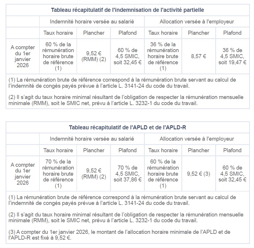 Compte tenu de l’augmentaiton du Smic au 1er janvier 2026, le taux horaire minimum del’allocation d’actvité partielle, de l’APLD et de l’APLD-R pour toutes les demandes d’indemnisation au titre des heures chômées à compter du 1er janvier 2026 est modifié par un décret du 29 janvier 2026.