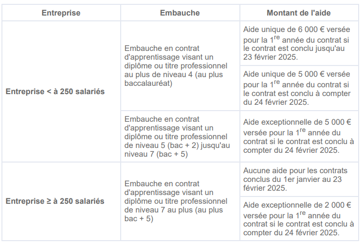 - une aide exceptionnelle qui s’applique aux contrats d’apprentissage préparant à un diplôme de niveau 5 (bac + 2) jusqu’au niveau 7 (bac + 5). Cette aide est temporaire et s’applique aux contrats d’apprentissage conclus du 24 février au 31 décembre 2025.